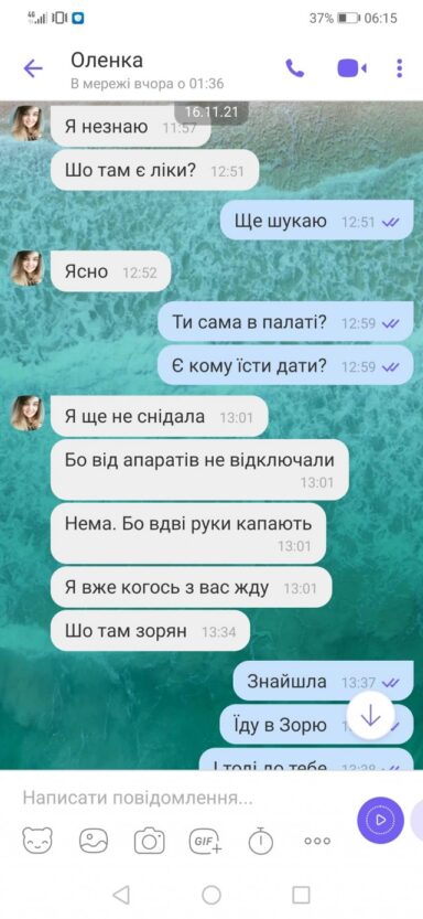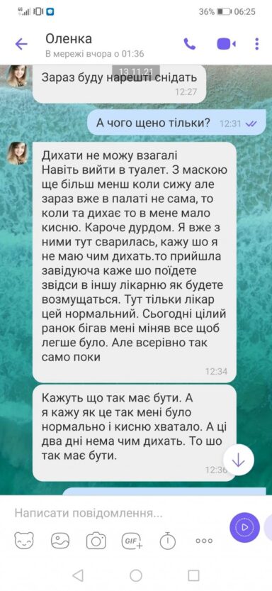 «Я вже з ними тут лаялася, тому що в палаті я не одна, і коли та (сусідка – ред.) дихає, то я задихаюсь. Прийшла завідувачка і сказала, що, якщо обурюватимуся, то поїду до іншої лікарні. А тут лікар нормальний. Сьогодні весь ранок біля мене бігав, щоб було легше. Але однаково погано», — скаржилася Олена мамі.
