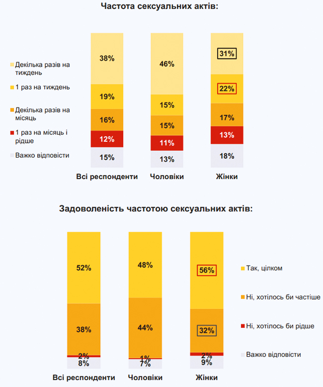 Дослідження, яке проводилося серед українців віком від 18 до 60 років, що мешкають в містах з населенням 50 тисяч жителів та більше (всього було опитано 1099 людей), показало, що переважна більшість респондентів (57%) займаються сексом раз на тиждень і частіше.