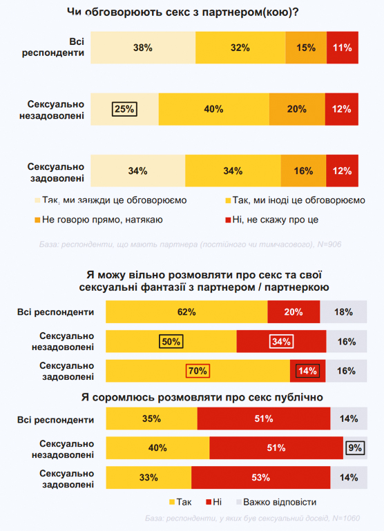 Зауважимо, що згідно з дослідженням Gradus Research, переважна більшість українців обговорює зі своїми сексуальними партнерами те, що їм не сподобалося під час сексу (68%), а також секс загалом та особисті сексуальні фантазії (62%).