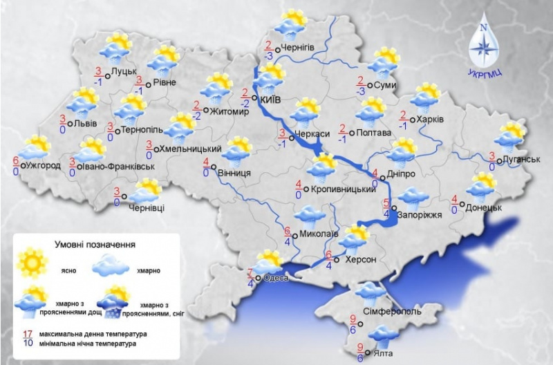 Температура вночі 0-5 морозу, вдень від -1 морозу до +4 тепла, на Закарпатті +3+8 тепла; у південній частині вночі +1+6 тепла, вдень +4+9.