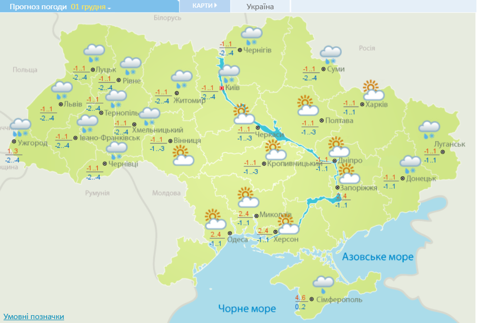 Прогноз на 30 листопада: в останній день листопада цього року буде сніг на заході, на півдні та сході продовжуть йти дощі, тільки центральні регіони матимуть суху погоду. Температура коливатиметься від -1 до +6.