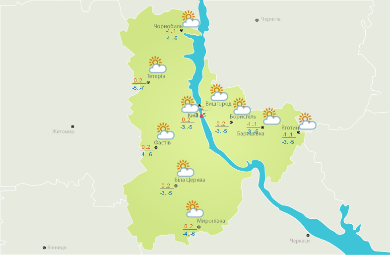 У Києві завтра очікується мінлива хмарність без опадів. Температура повітря вдень становитиме від 0 до + 2, вночі від -3 до -5.