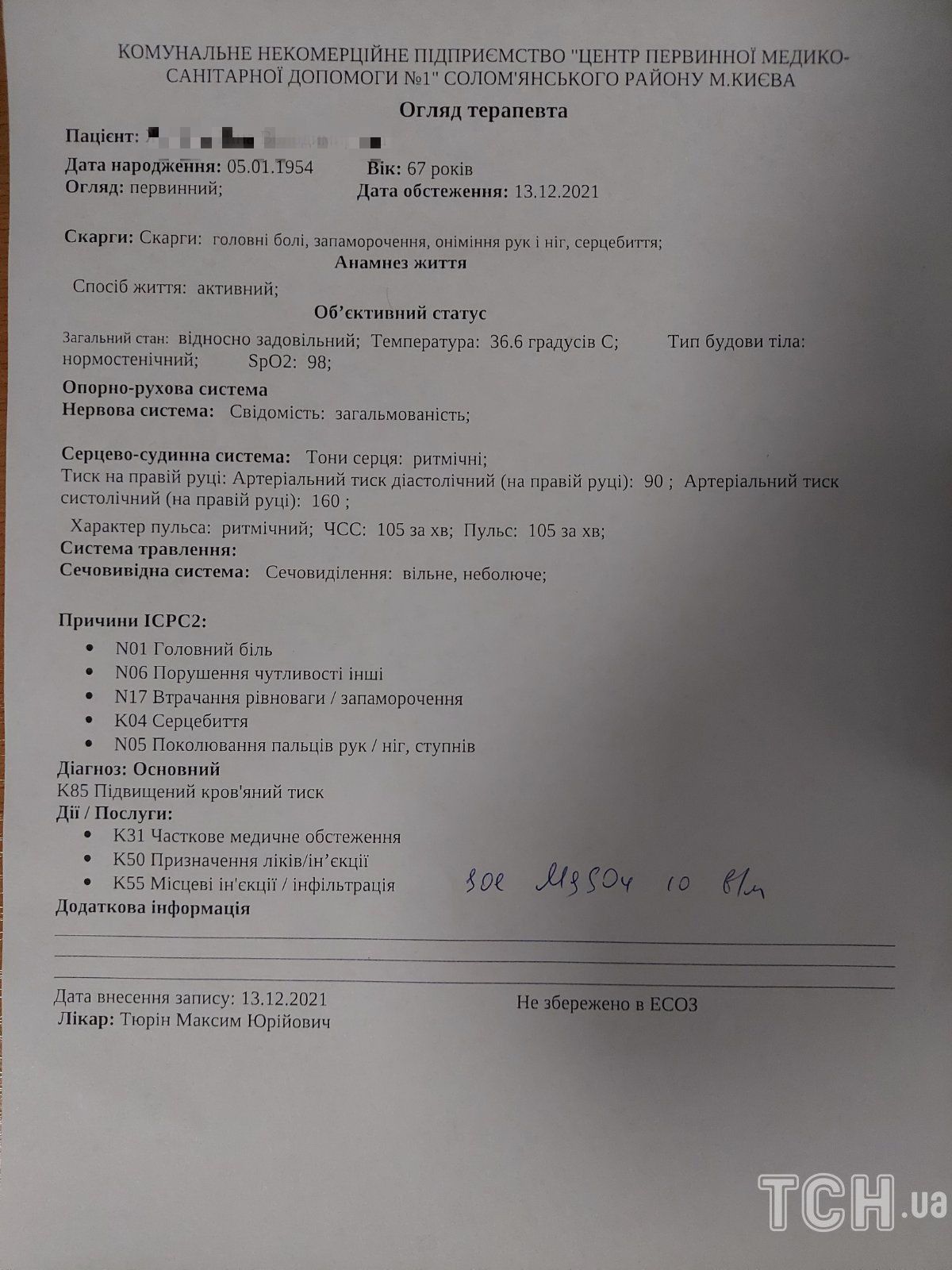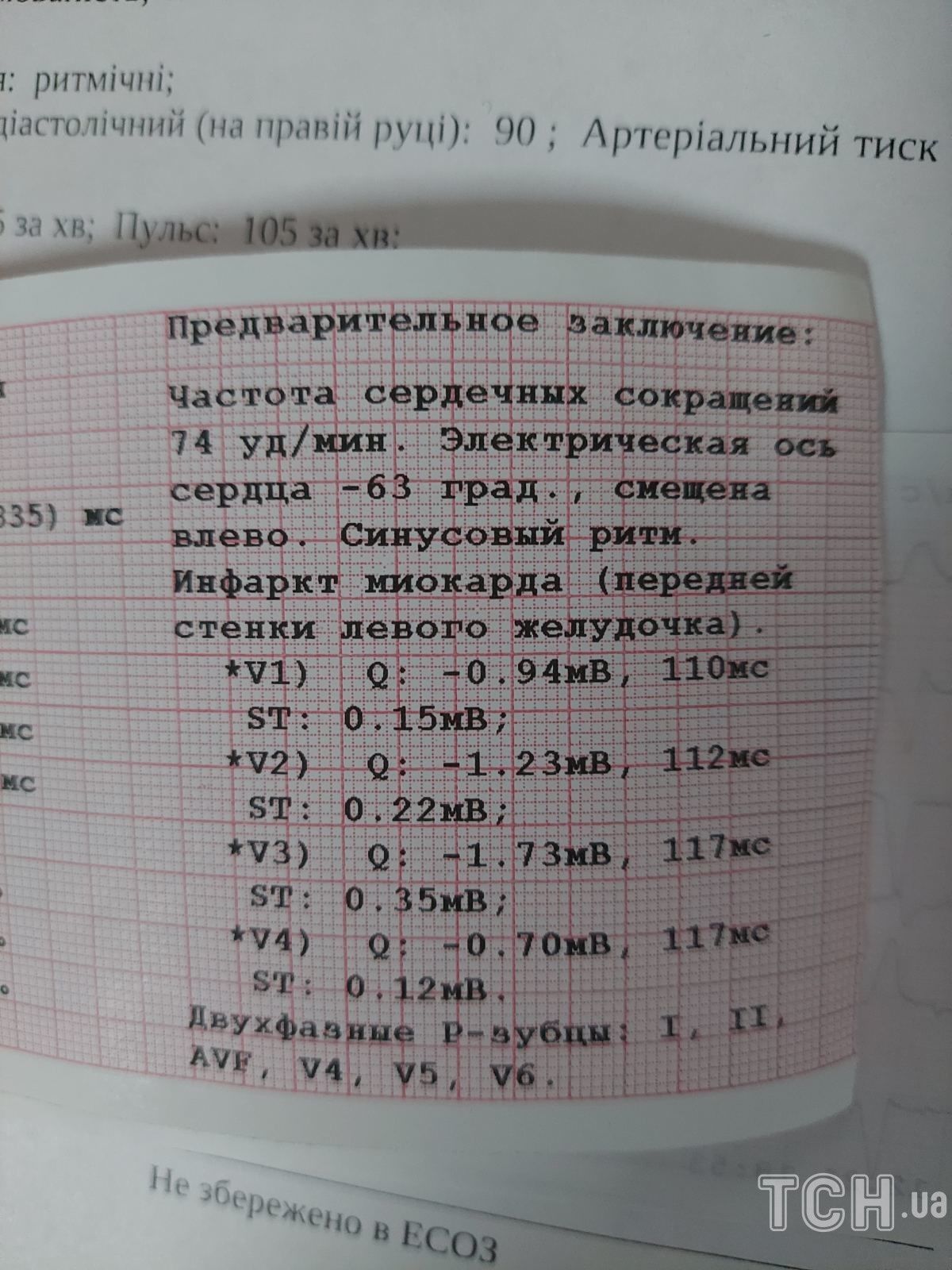 Родич потерпілої показав фото огляду терапевта після інциденту. На прийомі жінка скаржилася на головний біль, запаморочення, серцебиття, поколювання кінцівок і підвищений кров’яний тиск. Попередній висновок кардіограми – інфаркт міокарда.