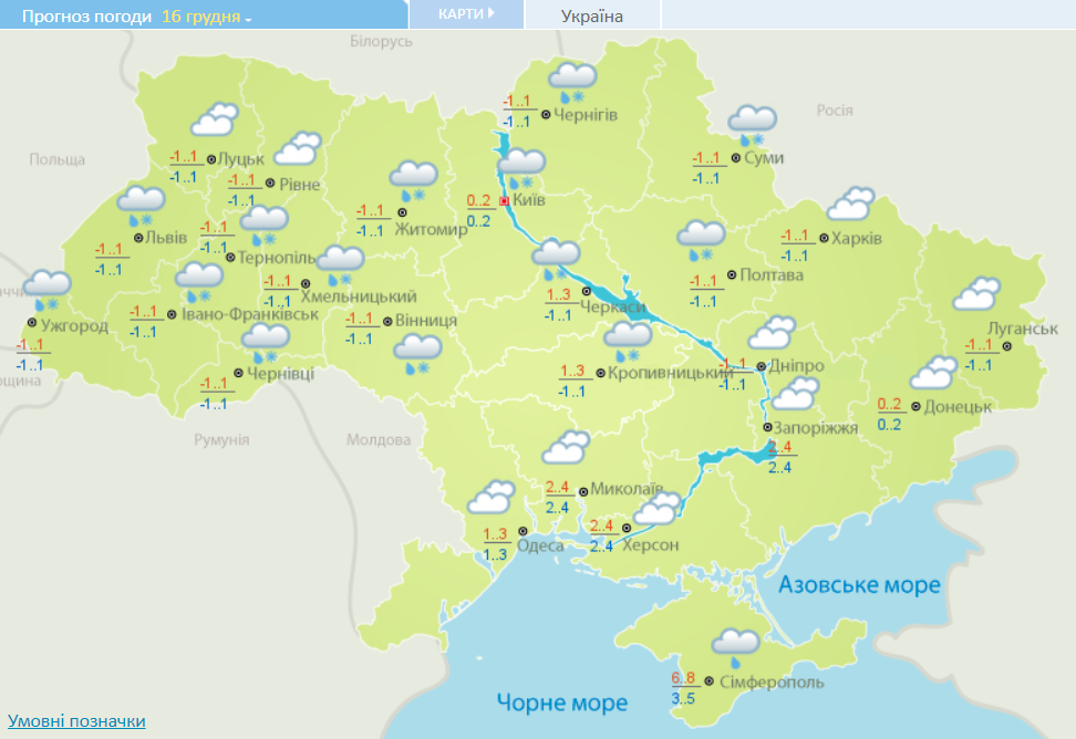 Карта погоди в Україні 16 грудня (фото: meteo.gov.ua)