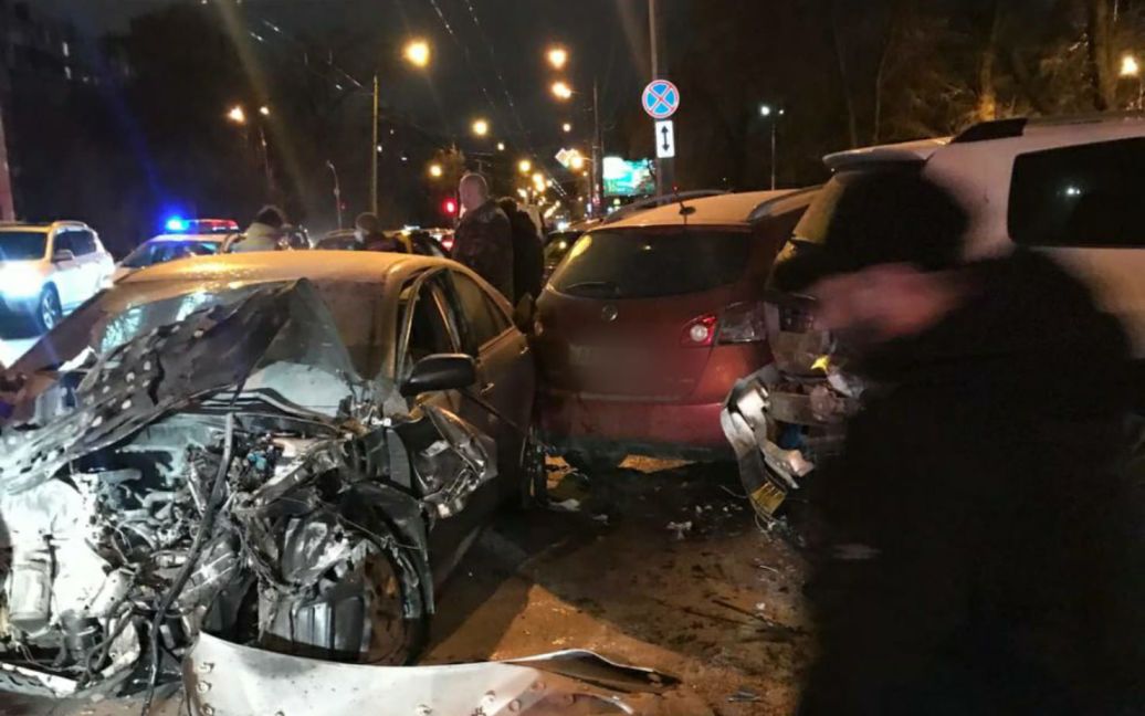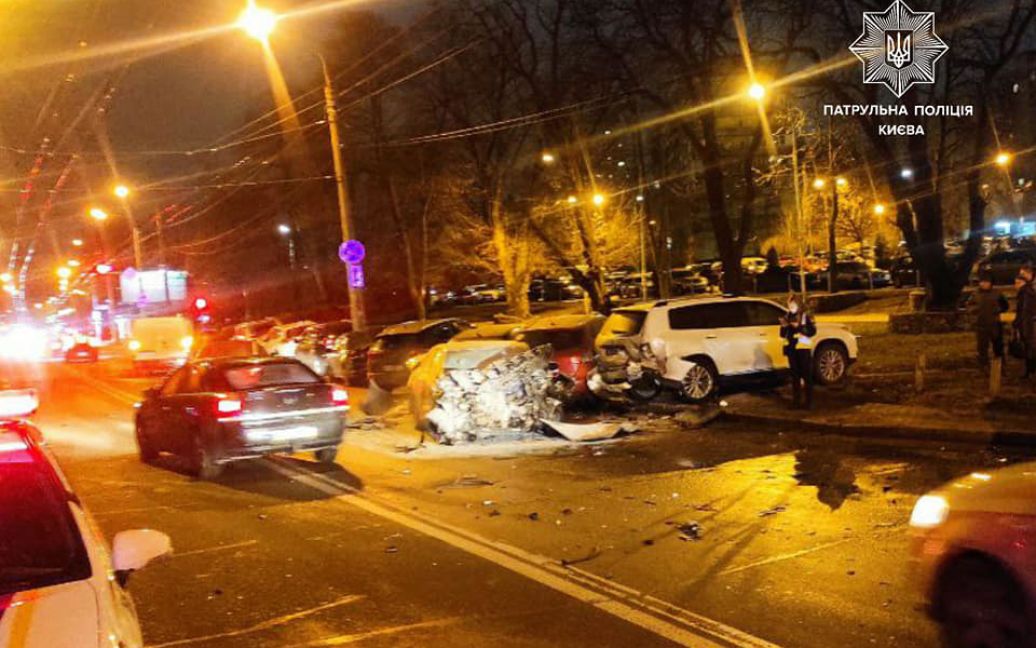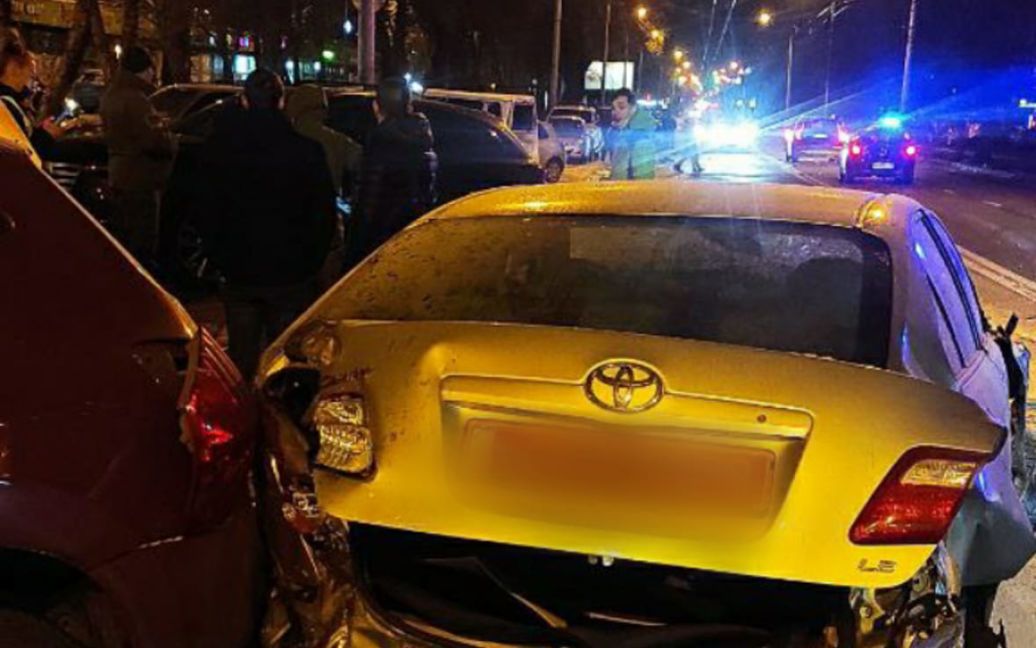 У Подільському районі Києва у ніч проти 18 грудня сталася аварія: водій на швидкості увігнався відразу у 10 автівок, які від удару розкидало по всій дорозі.