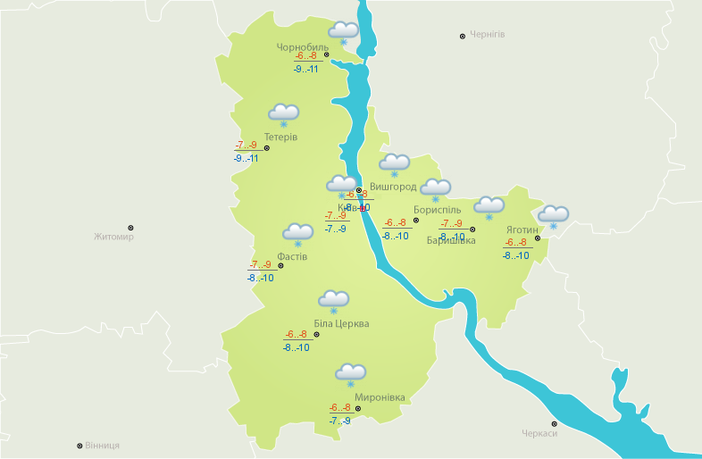 У Києві завтра очікується сніг. Температура повітря вдень і вночі сягатиме позначок від -9 до -7.