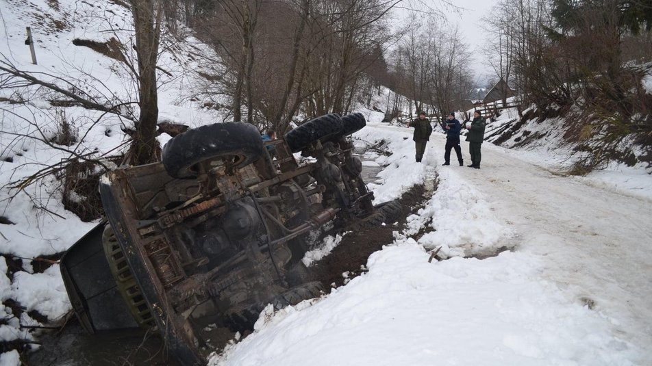 “Про виявлений факт працівники повідомили мобільну рейдову бригаду Ясінянського лісгоспу, яка виїхала на зустріч лісопорушникам збоку селища Ясіня. Втікаючи від переслідування, рухаючись у бік населеного пункту присілку Стебний, вантажівка з деревиною перекинулася у потічок, а невідомі особи зникли з місця аварії” — йдеться у повідомленні.