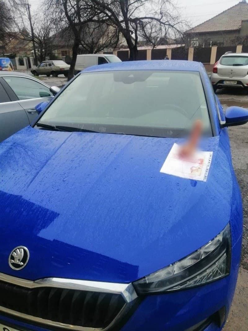 В Ужгороді біля дев’ятиповерхівки на вул. Комендаря, 78, на капот припаркованого синього автомобіля “Шкода” хтось саморізом прикрутив фалоімітатор.