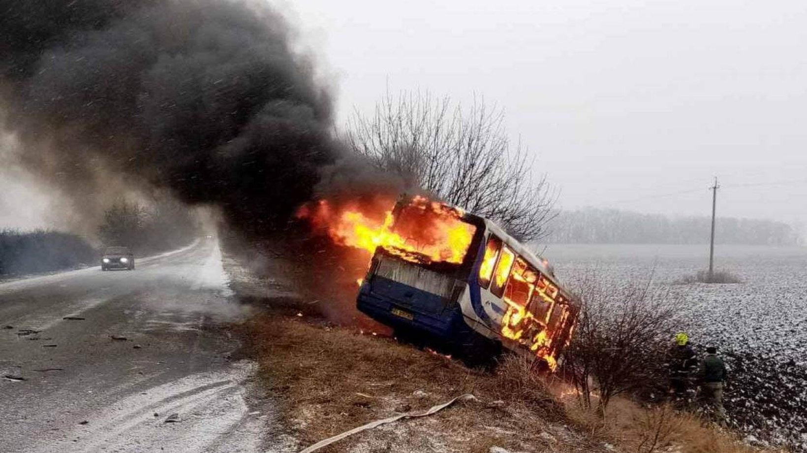 Як повідомляють у пресцентрі Державної служби з надзвичайних ситуацій, водій легковика раптово вилетів на “зустрічку”, де зіткнувся з автобусом. Обидва транспортні засоби вилетіли на узбіччя в кювет, де спалахнули.
