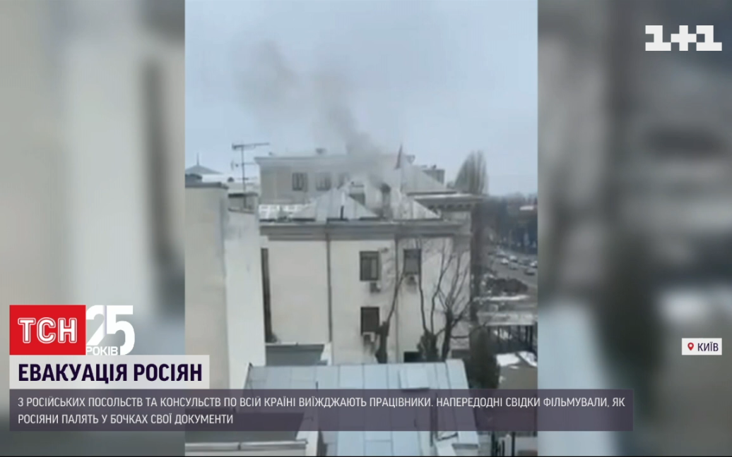 Готуватися до від’їзду в Києві почали ще задовго до заяви російського МЗС. Уже не один раз кияни помічали, як звідти йде дим. Імовірно, там саме спалювали секретні документи. Уперше це зафільмували на відео тиждень тому. Тоді дим ішов серед білого дня, учора – диміло вже пізно ввечері.