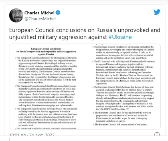 “Європейська Рада найсуворішим чином засуджує неспровоковану та невиправдану військову агресію Російської Федерації проти України. Своїми незаконними військовими діями Росія серйозно порушує міжнародне право та принципи Статуту ООН та підриває європейську та глобальну безпеку та стабільність”, – йдеться, зокрема, у заяві лідерів ЄС.