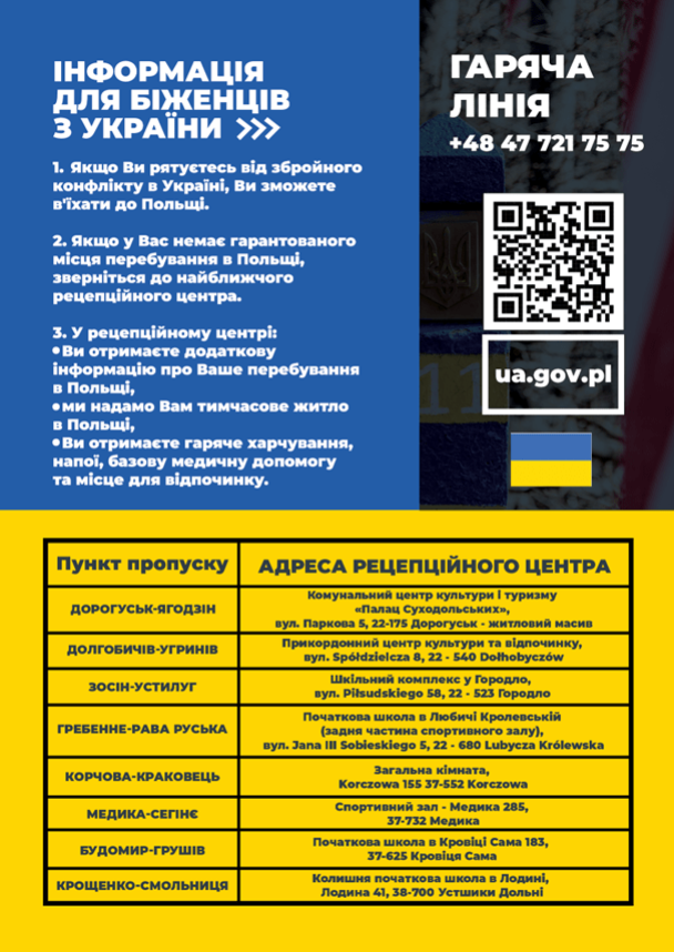 Усі особи, які змушені евакуюватися у зв’язку з війною Росії проти Украіни і не мають гарантованого місця перебування (місця на ночівлю) у Польщі, можуть звернутися до рецепційного центру. Там вони одержать: інформацію щодо перебування у Польщі; їжу; основну медичну допомогу; місце для відпочинку. Потім їм буде повідомлено про те, де їх тимчасово поселять. Усі біженці з України мають доступ до безкоштовної медичної допомоги та польських лікарів.