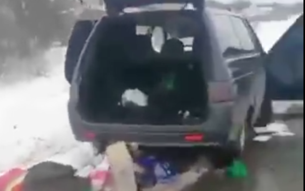 На опублікованому ним відео видно, як уздовж дороги стоять лкгкові авто та мікроавтобуси з відчиненимибагажниками і дверцятами, а навколо розкидані різні речі та одяг. Людей поруч ніде немає.