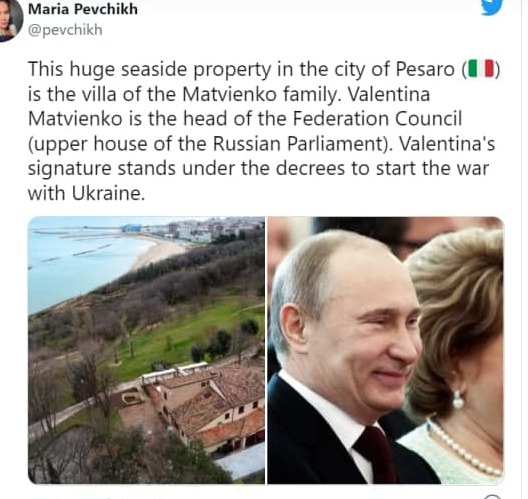 “Ця величезна приморська нерухомість у місті Пезаро – вілла родини Матвієнків. Валентина Матвієнко – голова Ради Федерації (верхня палата російського парламенту). Під указами про початок війни з Україною стоїть підпис Валентини”, – написала журналістка.
