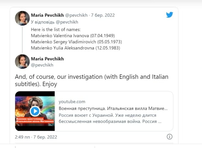 “Матвієнко дуже хоче, щоб ніхто не знав, що це її італійська власність, але вона також хоче, щоб її відремонтували. Прямо біля воріт вілли ми знайшли ім’я замовника: це Сергій Матвієнко, її син. Не дивно, що він також розбагатів на пограбуванні росіян”, – додала Марія Певчих.