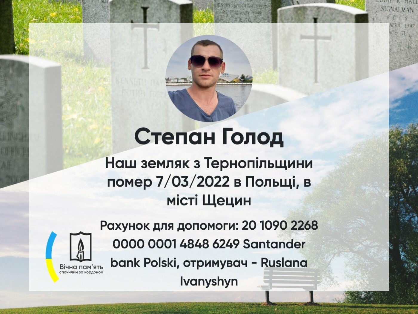 “Наш земляк з Тернопільщини, 1991 р/н, помер 7/03/2022 в Польщі, в місті Щецин. Працював будівельником та на тяжких роботах. Просимо молитви за Царство Небесне для пана Степана. Вічна, світла пам’ять йому”, – йдеться у повідомленні. Про причини смерті молодої людини наразі не повідомляється.