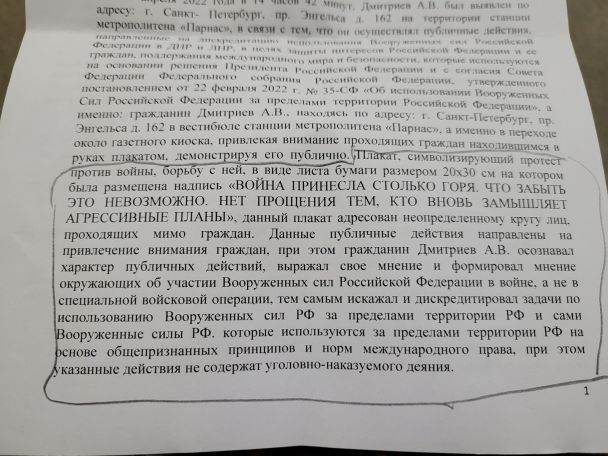 В ухвалі суду йдеться про те, що 7 квітня Дмитрієв стояв у вестибюлі станції метро “Парнас” з плакатом, на якому було написано: “Війна принесла стільки нестерпних випробувань, горя та сліз, що забути це неможливо. І немає прощення та виправдання тим, хто знову замишляє агресивні плани”.