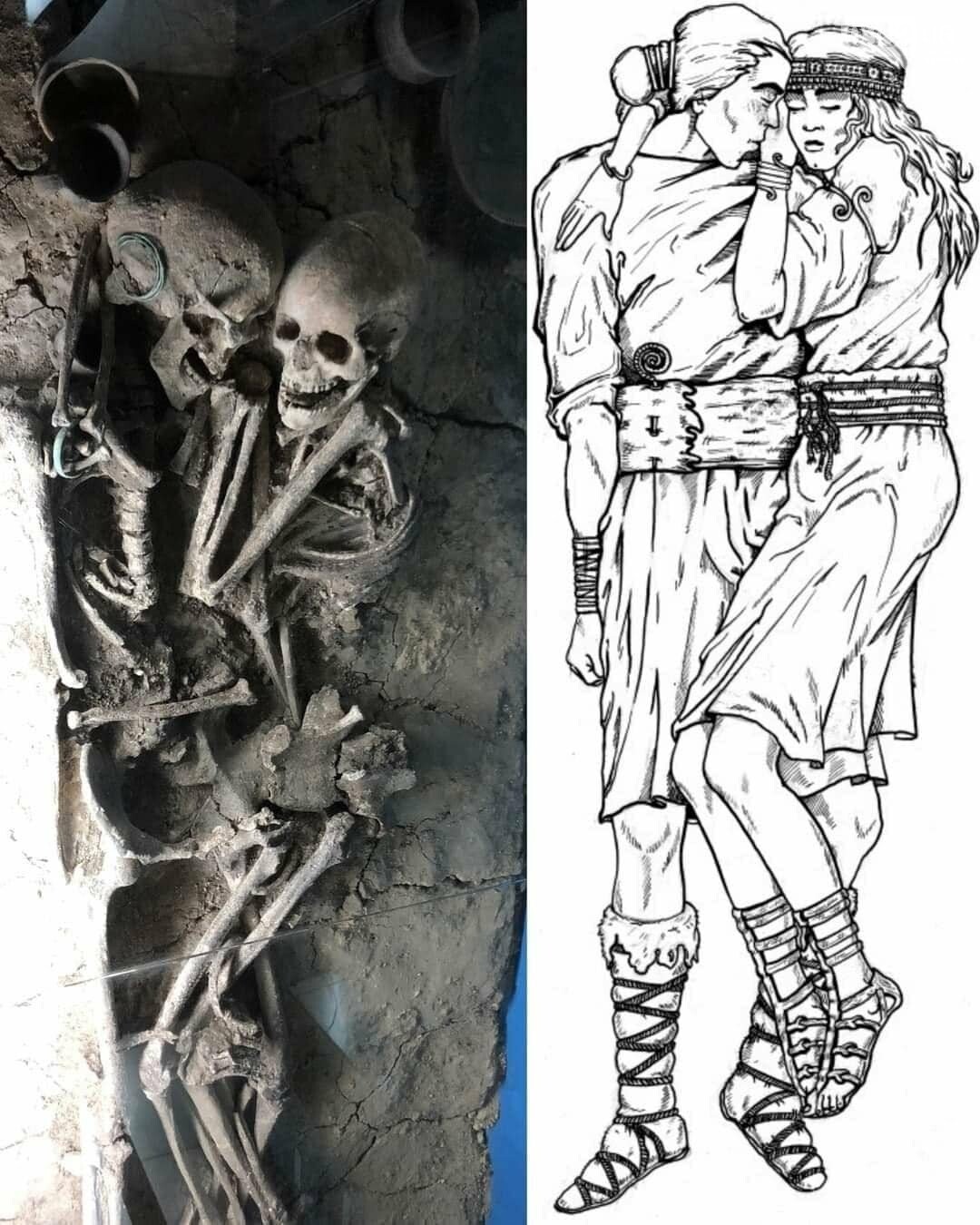 Могилі – орієнтовно 3 тис. років. Жінку добровільно поховали живою, щоб супроводжувати чоловіка на той світ, вважають археологи. Фахівці з аутопсії кажуть, що не можна було б розмістити тіло жінки в таке любляче положення, якби вона вже була мертвою. Експерти кажуть, що ймовірно, жінка обрала померти та бути похованою разом з чоловіком.