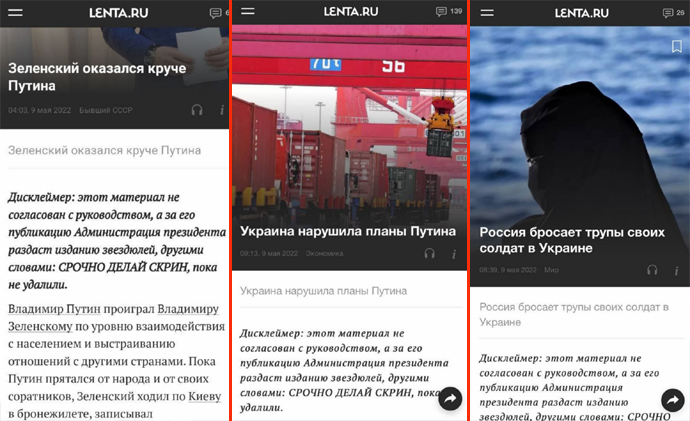 “На Lenta.ru з’явилися понад десять матеріалів із критикою президента Володимира Путіна і війни в Україні. Хоча зараз вони вже зникли із сайту, копія головної сторінки збереглася у веб-архіві”,- ідеться у повідомленні.