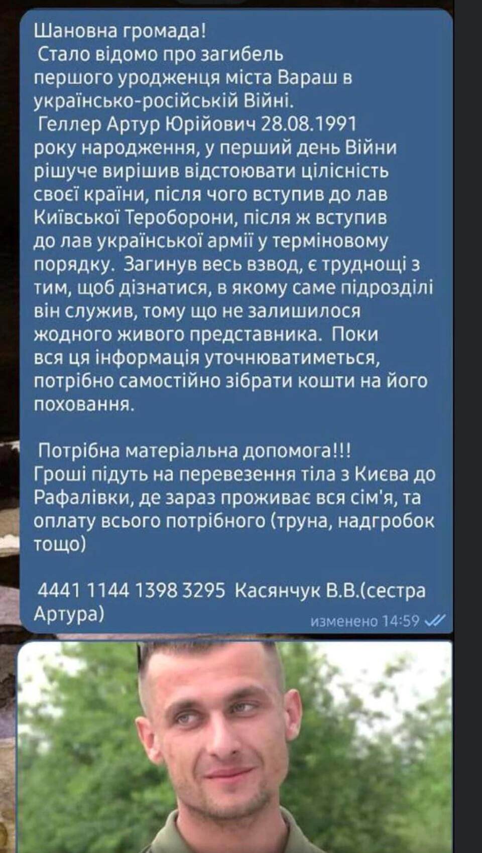 Повідомляють про загибель Артура Геллера, уродженця Вараша.