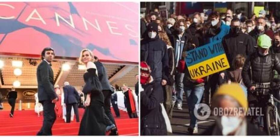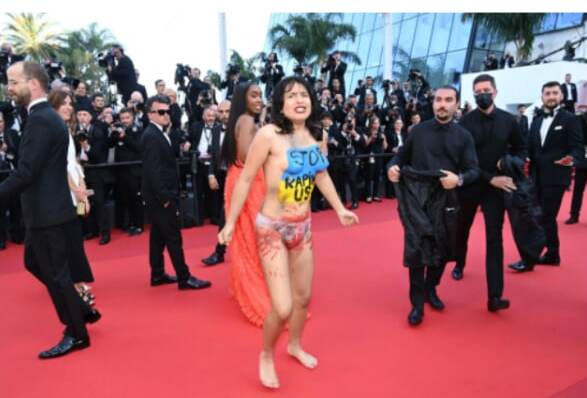 На червоній доріжці Каннського кінофестивалю на прем’єрі фільму Джорджа Міллера “Три тисячі років туги” у п’ятницю, 20 травня, гола активістка влаштувала акцію протесту на підтримку України. Зокрема, вона розфарбувала свій тулуб, зобразивши на ньому український прапор, та написала чорною фарбою “Припиніть нас ґвалтувати”.