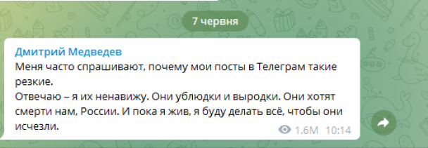 Маріонетка Путіна відповів на запитання, чому його публікації такі різкі. “Відповідаю – я їх ненавиджу. Вони недолюдки і виродки. Вони бажають смерті нам, Росії. І поки я живий, я робитиму все, щоб вони зникли”, – заявив Медведєв, не уточнивши, кого саме збирається знищувати до кінця свого життя.