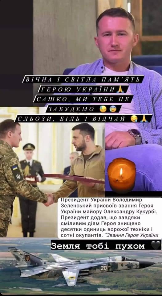 “З сумом можемо офіційно сповістити, що 26 липня 2022 року, захищаючи небо України, загинув Олександр Васильович Кукурба, 1994 р.н., уродженець с. Верхній Вербіж Нижньовербізької територіальної громади Івано-Франківської області — український військовослужбовець, майор, начальник розвідки штабу 299-ї бригади тактичної авіації Збройних сил України, Герой України.