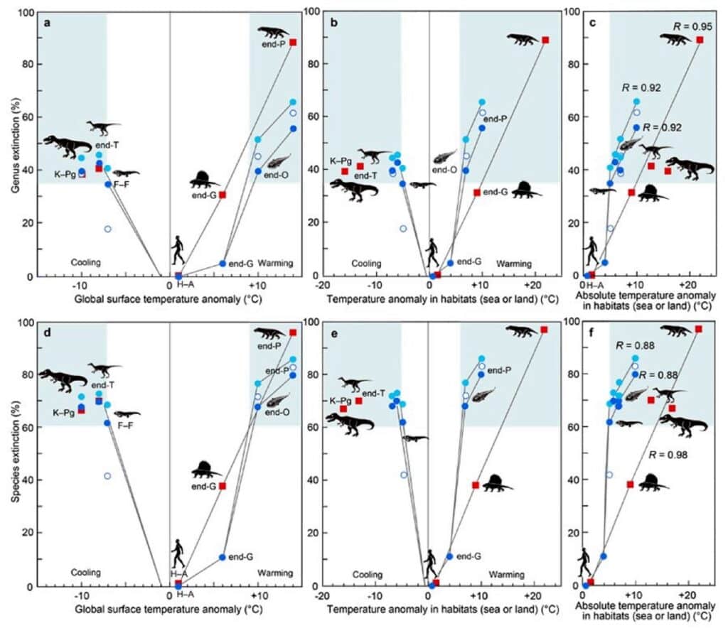 Для найбільших масових вимирань відхилення повинно бути дуже велике і відповідати підвищенню середньої глобальної температури на 9 градусів за Цельсієм або ж – падіння на 7 градусів.