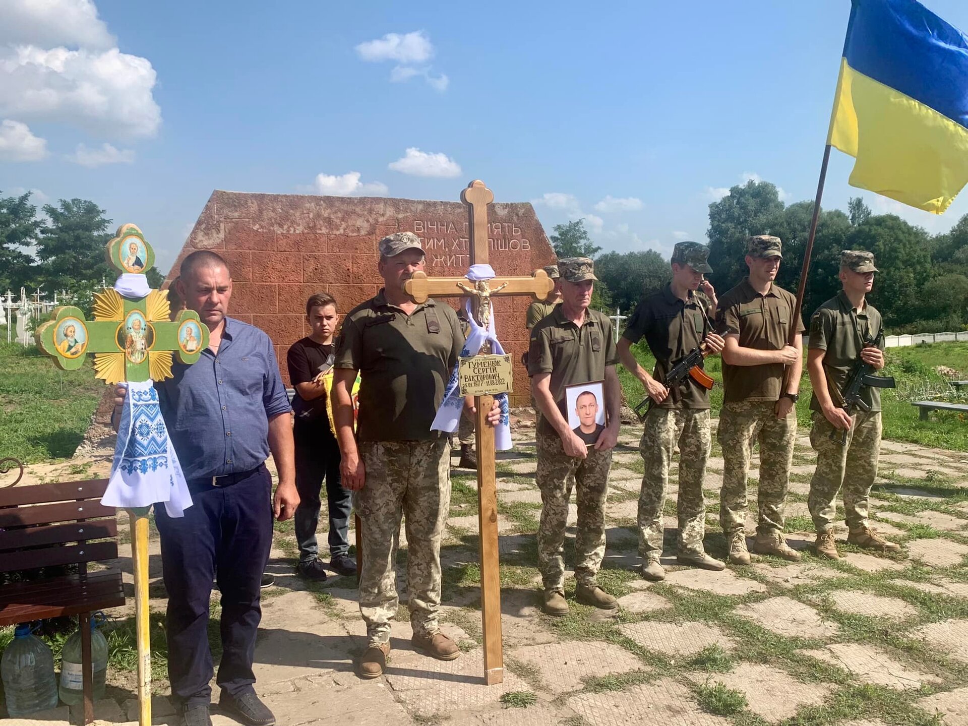Поховали військовослужбовця з усіма почестями під залпи пострілів почесної варти та звуки духового оркестру на місцевому кладовищі.