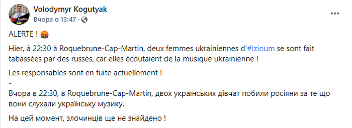 У невеликому селищі у Франції, на Лазурному березі, невідомий чоловік побив двох українок за те, що вони слухали по телефону пісню українською мовою. Про це на своїй сторінці у facebook розповів віцепрезидент Об’єднання українців Франції Володимир Когутяк. За його словами, у однієї з жінок зламано носа і обидві вони отримали струс мозку.