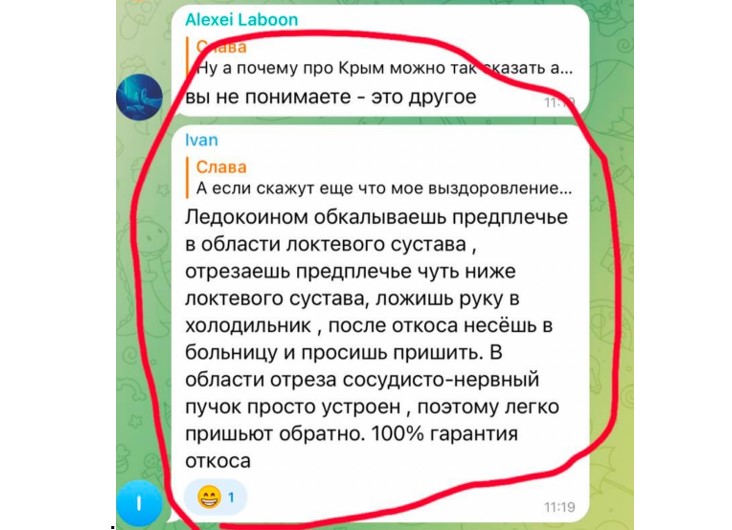 В одному з Telegram-каналів чоловіку, який підлягає мобілізації, якісь жорстокі пранкери порадили відрізати руку, із можливістю потім пришити її назад.