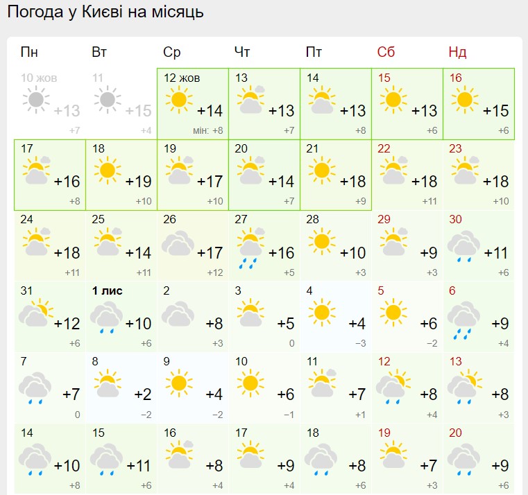 За прогнозом іншого синоптика Володимира Деркача, тепла осіння погода протримається до Покрови. Потім похолодає, особливо вночі. Можливі невеличкі опади.