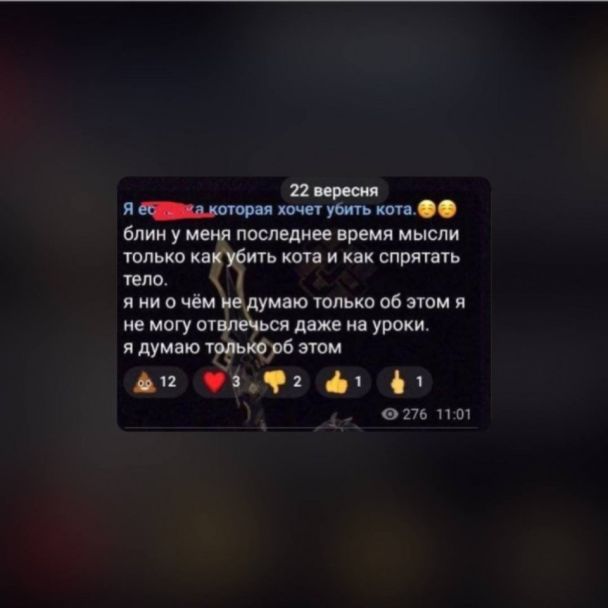 “У мене останнім часом думки лише про те, як вбити кота і як заховати тіло. Я ні про що не думаю, тільки про це. Не можу відволіктися навіть на уроки. Я думаю тільки про це”, – йдеться у повідомленні шкуродерки.