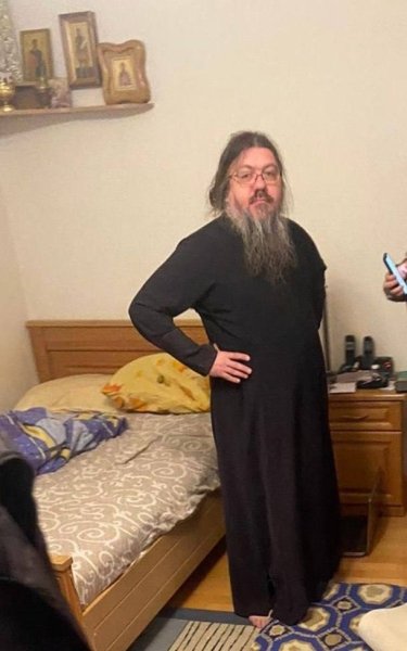 На одному з них — Архімандрит Микита в рясі, але босий, стоїть на тлі постелі. На підлозі біля його ніг стоїть ноутбук.