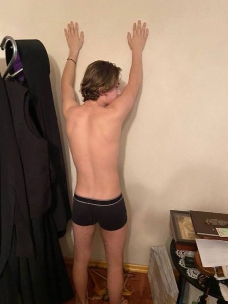 На другому фото обличчям до стіни стоїть молодий чоловік, на якому з одягу лише спідня білизна.