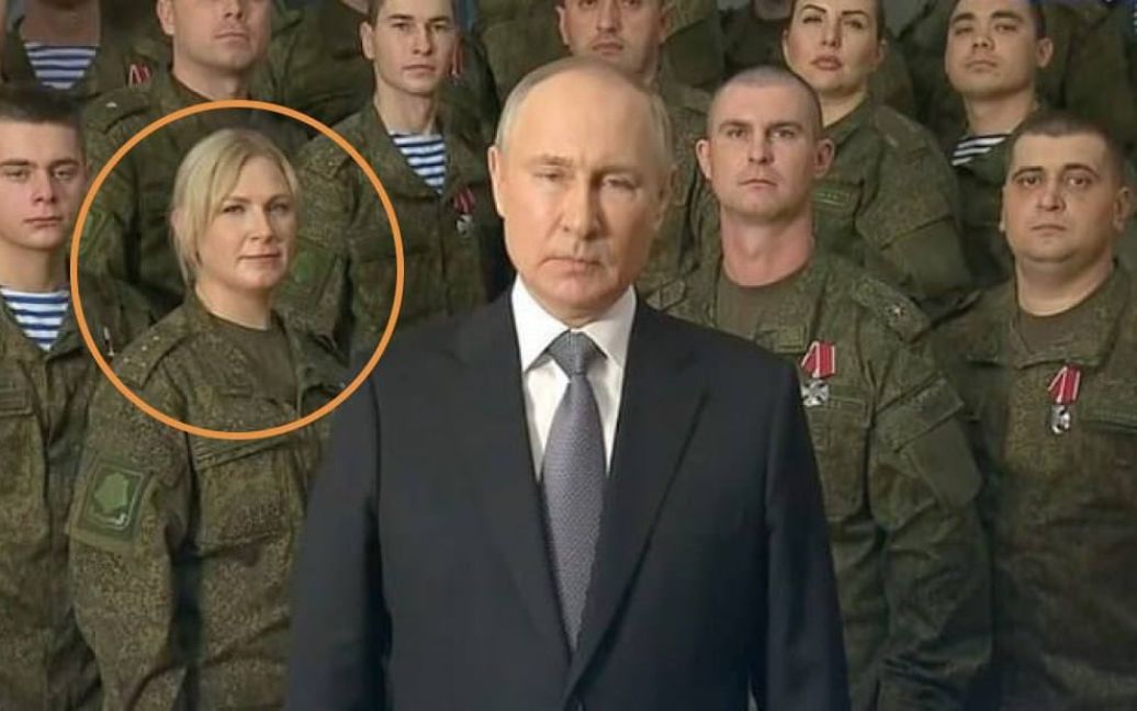 Поряд з російським президентом, який цього року записав новорічне привітання на тлі псевдовійськових, стояла, ймовірно, співробітниця Федеральної служби охорони РФ, яка вже виконувала інші ролі, супроводжуючи кремлівського диктатора.