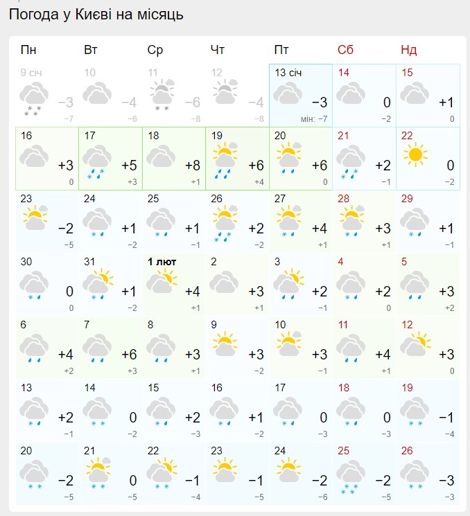 Синоптики ресурсу Gismeteo в прогнозі на місяць (дані для Києва) не передбачають суворих лютневих морозів чи снігопадів.