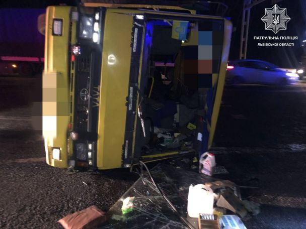 Судячи з фото ДТП, після зіткнення маршрутка перевернулася на бік.