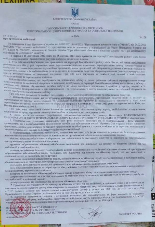 У Києві на під’їздах житлових будинків помітили паперові оголошення, де надрукований закон про мобілізацію та наказ для військовозобов’язаних прибути до районного військкомату до 31 січня. В соціальних мережах пишуть, що такі документи помітили на житлових будинках у Голосіївському районі столиці.
