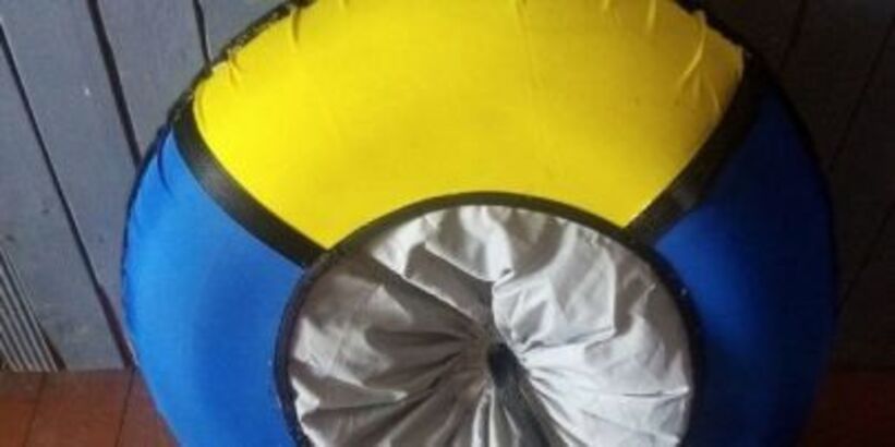Діти накинулись на хлопчика через надувні санчата у синьо-жовтому кольорі.