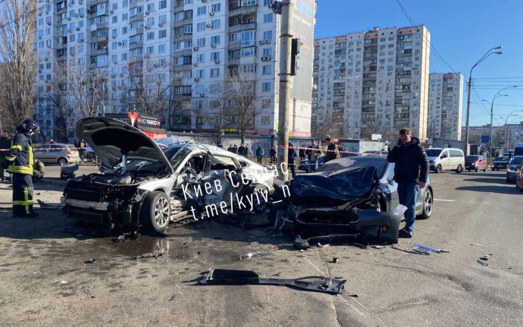 “Близько 9 годи ранку, водій автомобіля Tesla, рухався по вулиці Полку Азов в напрямку вулиці Йорданської. Він виїхав на регульоване світлофором перехрестя і здійснив проїзд на червоний сигнал світлофора. Внаслідок цього відбулося зіткнення ще з двома автомобілями – Toyota та Audi. Відомо, що через зіткнення отримали тілесні ушкодження водій та пасажир Audi, а також водій автомобіля Toyota. Їх госпіталізували до медичного закладу. Правоохоронці продовжують працювати на місці та встановлювати всі деталі та механізм цієї ДТП”, – розповіли сайту ТСН.ua в поліції Києва.