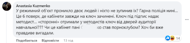 “У режимний об‘єкт проникло двоє людей і ніхто не зупинив їх? Гарна поліція нині. Це шостий поверх, де кабінети завжди на ключ зачинені. Ключ під підпис надає методист. “Сторонні” отримали у методистів ключ від дверей аудиторії навчальної? Чи це кабінет пані С*****нко став порноклубом? Хоч би вже правдиве вигадали”, – зазначила жінка під заявою університету в Facebook.