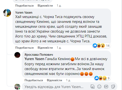“Друзі, я зараз підійму дуже важливу і болючу тему. Стосується вона УПЦ колишнього МП і сім’ї загиблого героя. Власне, річ у тім, що в неділю у закарпатському селі Чорна Тиса священник Свято-Успенського храму не дозволив занести тіло загиблого молодого хлопця Дмитра Спасюка до церкви перед погребінням, як заведено у гуцулів. Те що це не по-божому, ані навіть не по-людськи – тут кожен скаже. Я долучаюся до розголосу цієї ситуації ще й тому, щоб більше таке не траплялося”, – зазначається журналістка.