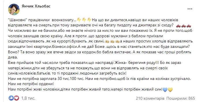 Я проти того, щоб здорові чоловіки їхали сюди відпочивати, як на курорт, а наших простих хлопців відправляли захищати їхні квартири, бізнеси, офіси.