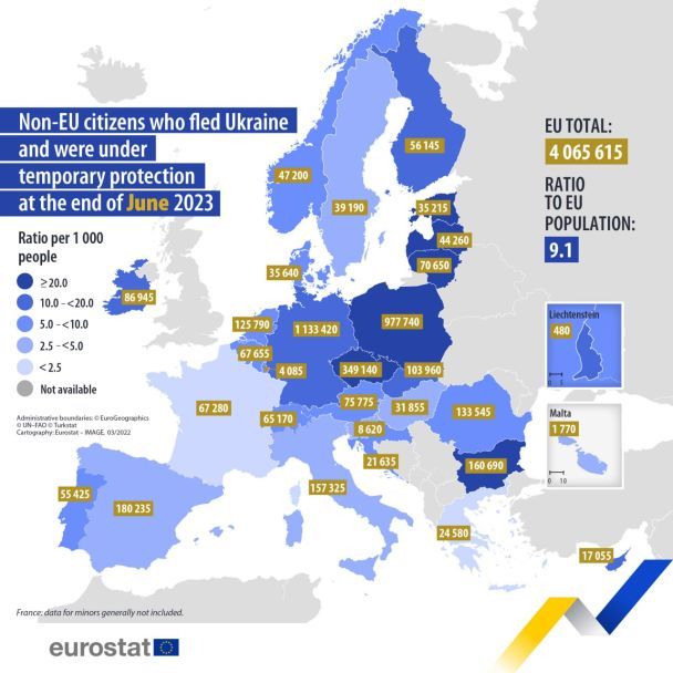За інформацією управління Верховного комісара ООН у справах біженців, зараз за кордоном перебуває 6,2 мільйона українців, які виїхали рятуючись від війни. А сайт Eurostat повідомляє про понад 4 мільйони українців, які мешкають в країнах ЕС. Біженці з України мешкають у різних країнах Європи. Найбільше тимчасовий захист наші люди отримують у Німеччині, Польщі, Чехії.