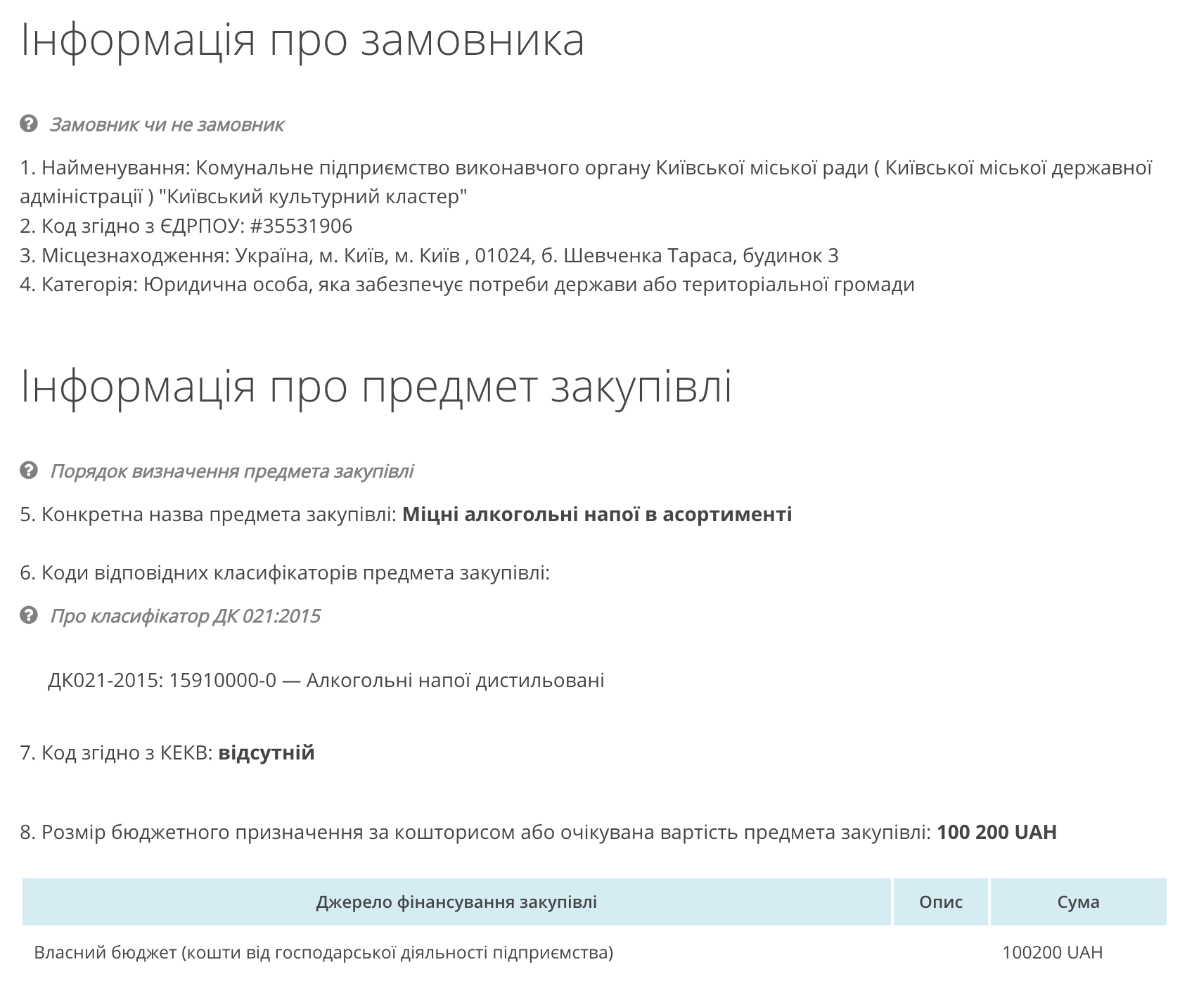 Київська міська державна адміністрація (КМДА) оголосила тендер на закупівлю міцних алкогольних напоїв на суму 100 200 гривень.