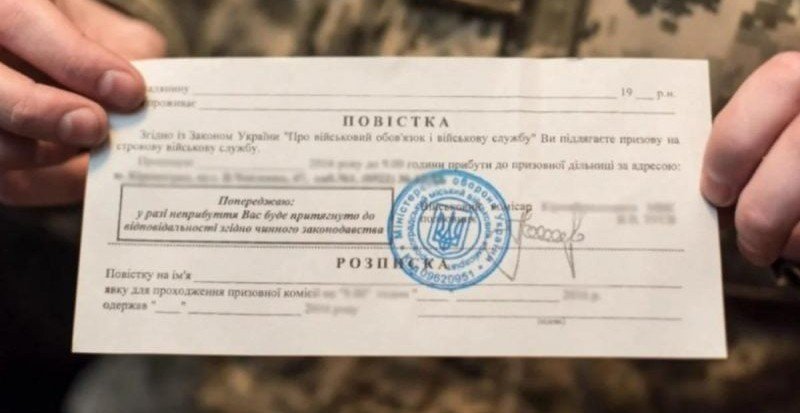 Повістка про призов на військову службу в ЗСУ. В ній ідеться про проходження строкової служби та про прибуття на призовний пункт.