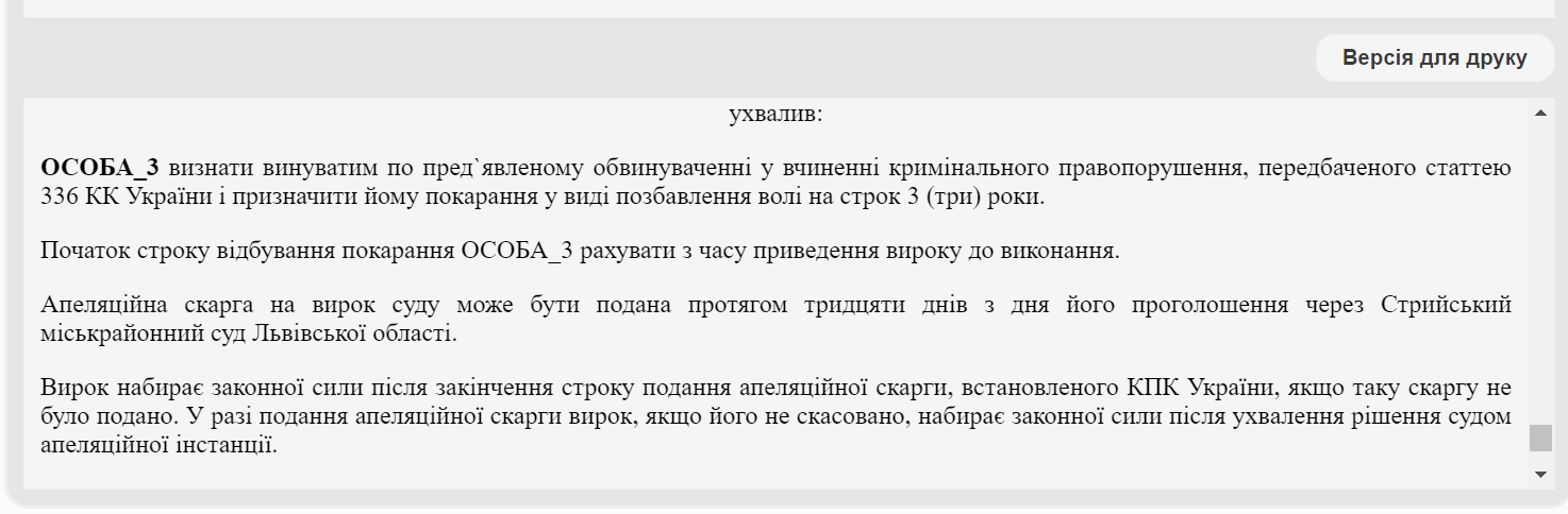 Про це йдеться у вироку Стрийського міськрайонного суду Львівської області.
