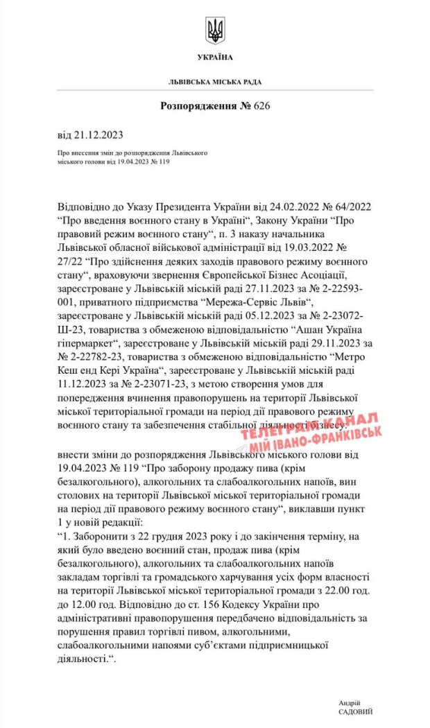 Послабити обмеження на продаж спиртного вирішили “з метою створення умов для запобігання вчиненню правопорушень на території Львівської міської територіальної громади на період дії правового режиму військового стану та забезпечення стабільної діяльності бізнесу”.