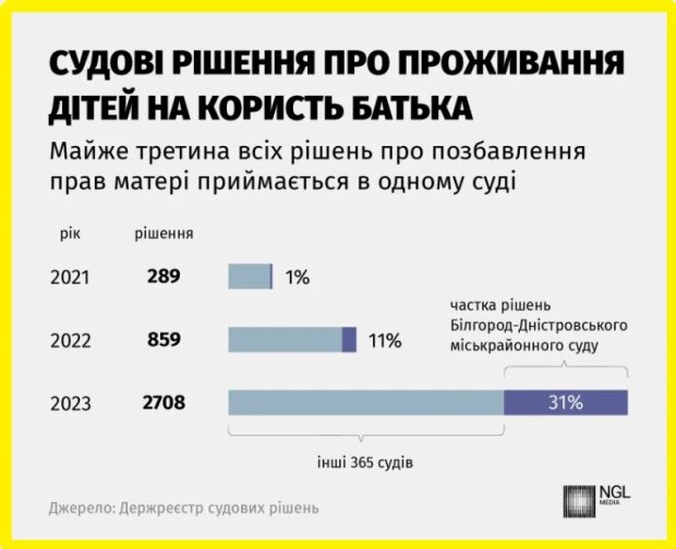 Причому, у 30% випадків ці рішення приймаються в тому самому суді Одеської області. Ймовірно, це схема ухилення від мобілізації для чоловіків, тому що в такому разі батько, визнаний єдиним опікуном дитини, не може бути призваний на фронт.